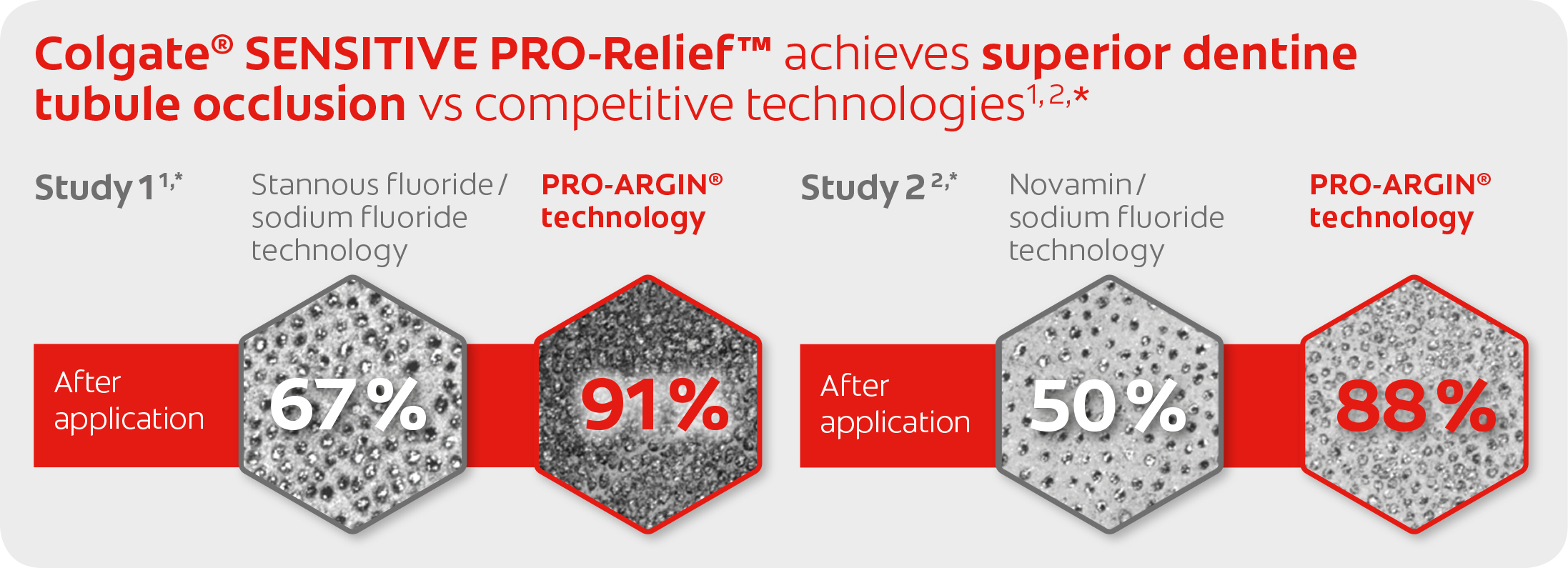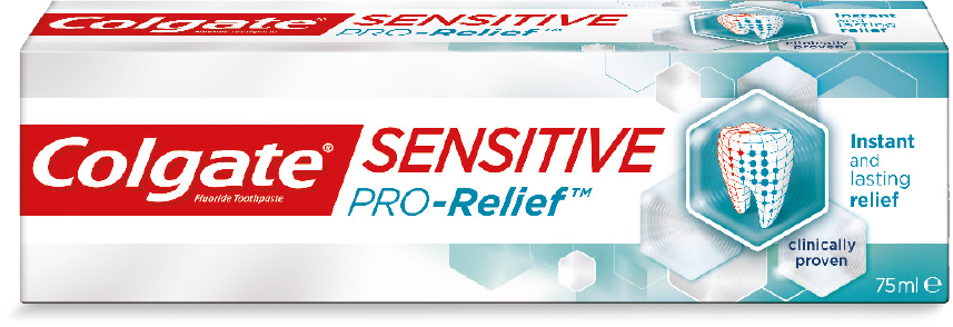Colgate Sesnsitive Pro-Relief toothpaste provides superior dentine tubule occlusion when compared with stannous fluoride/sodium fluoride technology (91% versus 67%) (Colgate data on file) and novamin/sodium fluoride technology (88% versus 50%) (Colgate data on file).