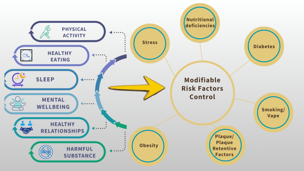 Oral health significantly influences overall disease risk. By adopting an evidence-based lifestyle medicine approach and providing advice on shared risk factors, without making diagnoses, we broaden our professional role.