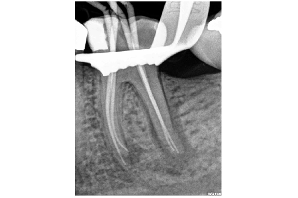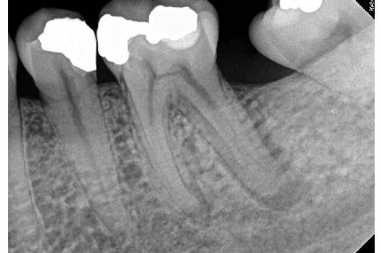 Figure 2a: Master cone radiograph. The apical foramen exits the root laterally on the mesial root. An apex locator is essential in these cases to determine the WL. b) Mid-fill radiograph - The distance between with apical constriction and root terminus increases with age due to secondary cementum deposition at the root apex (Figure 1)